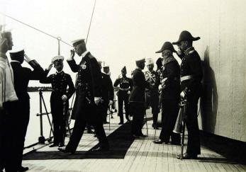 Король Швеции Густав V идет по палубе к трапу