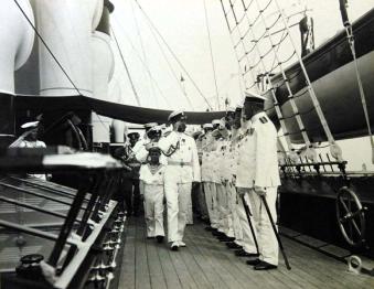 Император Николай II и наследник Алексей обходят офицеров выстроенных на палубе яхты "Штандарт".