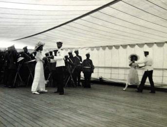 Слева с офицером танцует великая княгиня Ольга Николаевна, справа великая княгиня Анастасия Николаевна танцует с офицером.