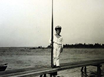 Цесаревич Алексей в матроской форме стоит на мостках с веслом в правой руке.