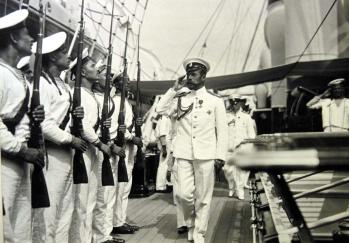 Император Николай II обходит караул выстроенный на палубе яхты "Штандарт".