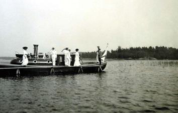 Вдовствующая императрица Мария Федоровна, император Николай II во время посадки на паровой катер.