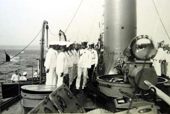 Император Николай II обходит команду эскадренного миноносца "Эмир Бухарский", выстроенную на палубе.