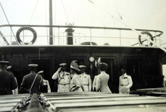 Императрица Александра Федоровна проходит по палубе яхты "Штандарт" мимо стоящих офицеров.