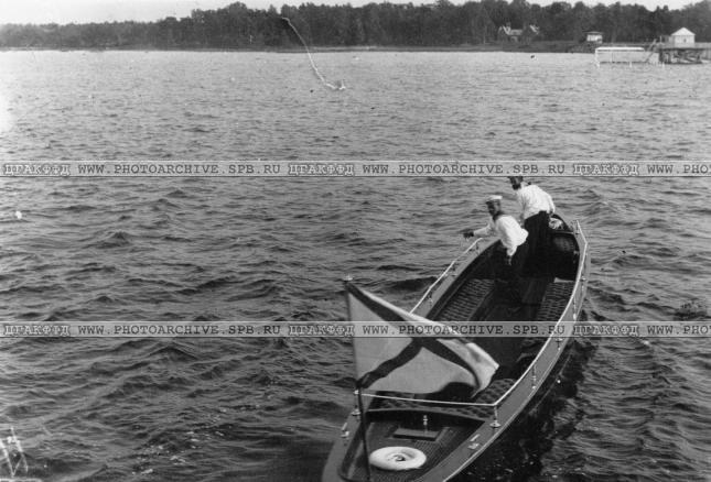 Вид моторного парового катера на заливе.1898 г.