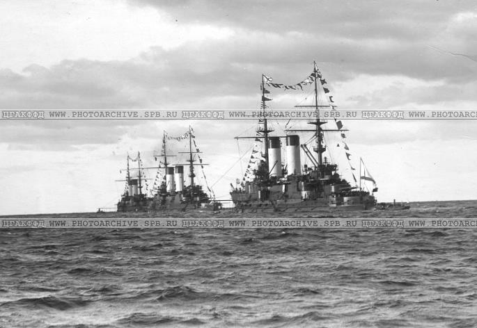 Эскадренные броненосцы "Бородино ", " Император Александр III " и " Князь Суворов " на рейде. Дата съемки 26 сентября 1904г.