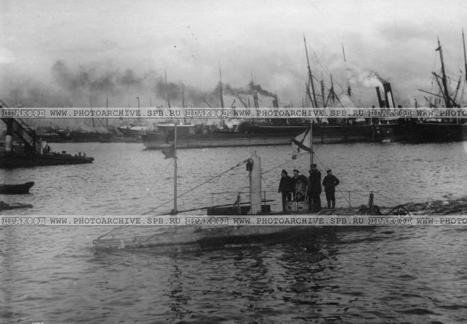 Вид кораблей в порту. На переднем плане - подводная лодка "Дельфин".