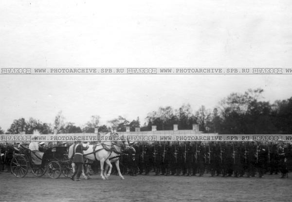 Императрица Александра Федоровна и наследник цесаревич Алексей в коляске проезжают вдоль фронта выстроившихся моряков в день празднования 200-летнего юбилея Гвардейского экипажа . Дата съемки 10 мая 1910г.