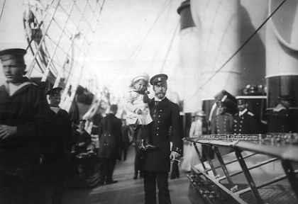 Император Николай II с наследником цесаревичем Алексеем на руках среди офицеров и матросов на палубе яхты "Штандарт".