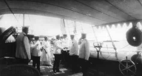 Император Николай II (3-й слева) беседует с офицерами на борту яхты "Штандарт"