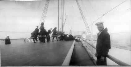 Император Николай II наблюдает за игрой своих дочерей с юнгами и офицерами на борту яхты "Штандарт".