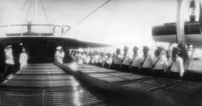Император Николай II приветствует команду на борту яхты "Штандарт".