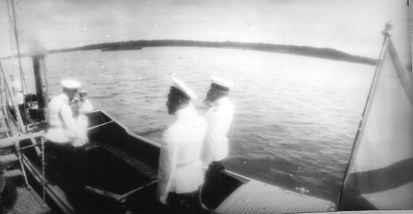 Император Николай II спускается по трапу военного корабля в паровой катер.