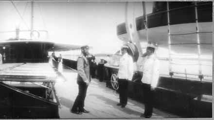 Император Николай II, дочери императора, великие княжны Мария и Анастасия (на втором плане), юнги и офицеры на палубе яхты "Штандарт".