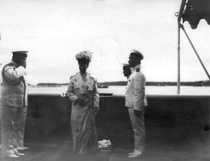 Офицеры императорской яхты "Штандарт" приветствуют вдовствующую императрицу Марию Федоровну на палубе яхты.