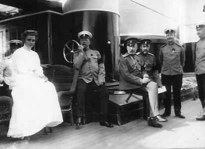 Командир яхты "Штандарт" И.И.Чагин (2-й слева), обер-гофмаршал императорского двора П.К.Бенкендорф (3-й слева), генерал-майор свиты А.А.Дрентельн (3-й справа) и др. на палубе яхты "Штандарт" во время плавания царской семьи в Шхерах.