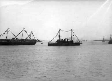 Русский миноносец на рейде в Финском заливе во время встречи короля Швеции Густава V Адольфа. Слева- императорская яхта "Штандарт".