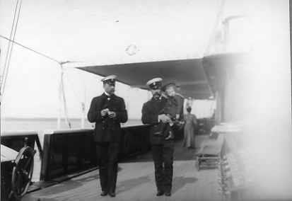 Император Николай II с наследником-цесаревичем Алексеем на руках, капитаном яхты "Штандарт" И.И.Чагиным на палубе яхты.