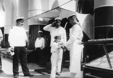 Сын императора Николая II цесаревич Алексей пробует пищу на палубе яхты "Штандарт"во время плавания царской семьи в Шхерах.