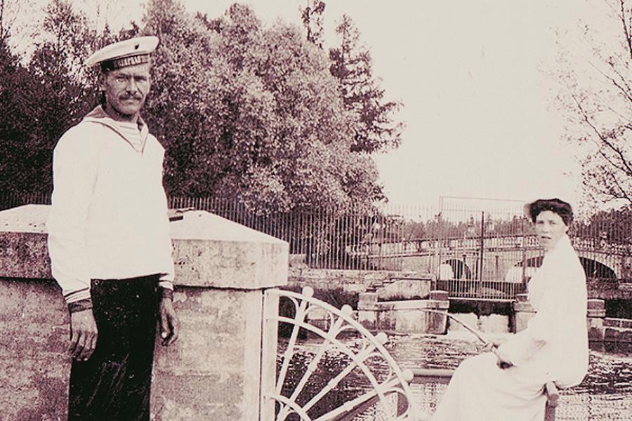 Ксения Александровна и матрос Гвардейского экипажа на рыбалке в Гатчинском парке у шлюза.