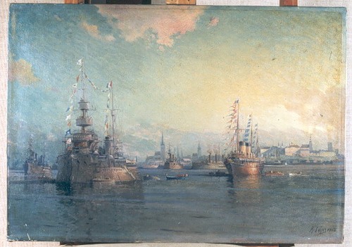 Репродукция работы А.Ганзена "Российский и французский флот в Ревеле". 1908г.