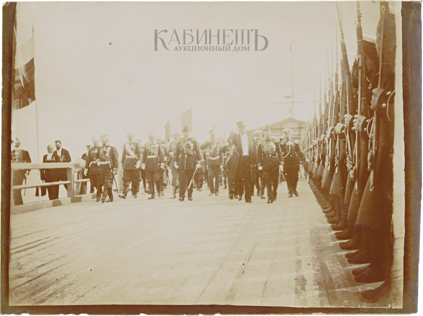 Император Николай II, великий князь Владимир Александрович, великий князь Михаил Александрович, великий князь Алексей Александрович, президент Французской республики Феликс Фор и сопровождающие лица проходят мимо почетного караула Гвардейского экипажа.