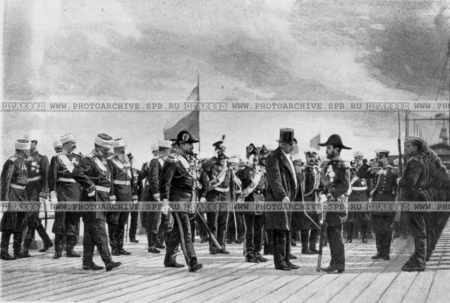 Встреча императора Николая II и президента Франции Феликса Фора на Петергофской военной пристани. Август 1897г.