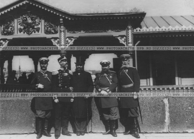 Итальянский король Виктор Эммануил III с сопровождающими его лицами и членами императорской свиты во главе с князем Долгоруким на пристани на Английской набережной у Николаевского моста.