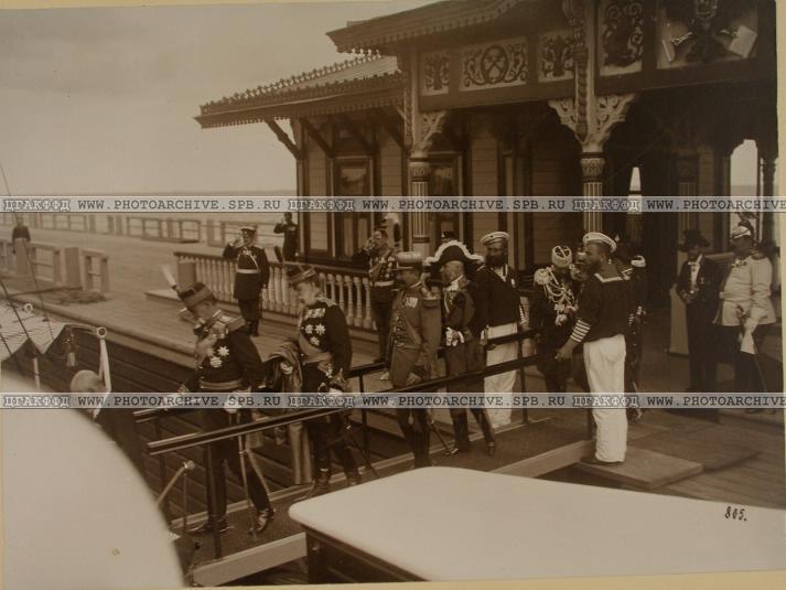 Члены румынской делегации, сопровождающие в поездке короля Карла I, сходят на берег (на набережной Невы).