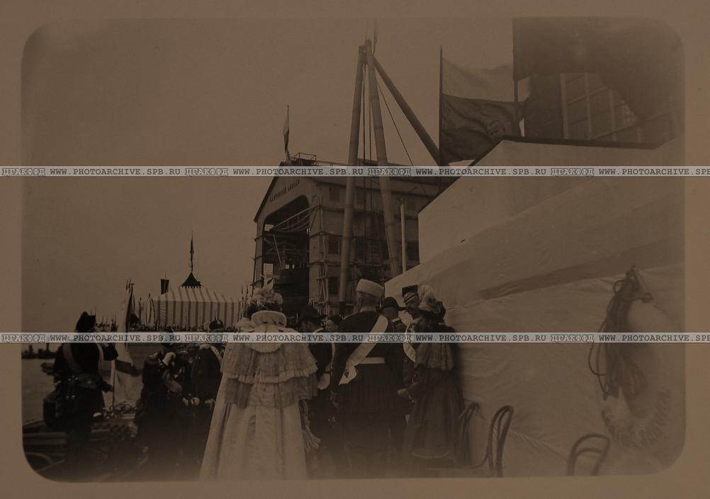 Члены императорской фамилии, прибывшие на Балтийский завод для участия в церемонии спуска на воду броненосца; в центре - великий князь Михаил Александрович, спиной стоят императрица Александра Федоровна и великая княгиня Елизавета Федоровна, великий князь Михаил Николаевич; боком стоит император Николай II.