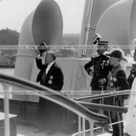 Император Николай II, президент Французской республики Раймон Пуанкаре, министр-президент Рене Вивиани и сопровождающие их лица на борту императорской яхты Александрия. Июль 1914 г